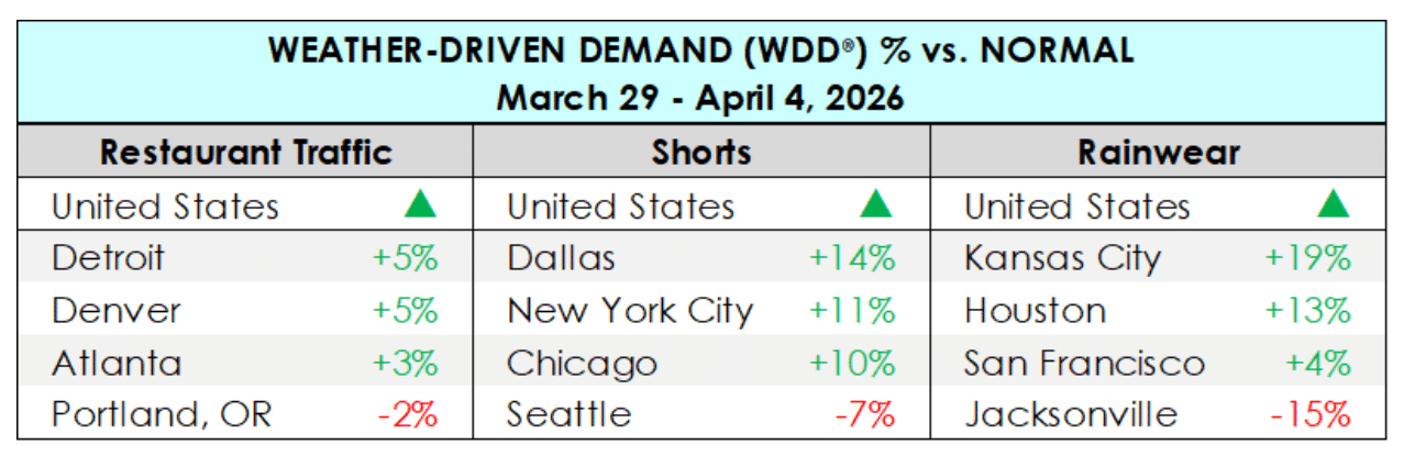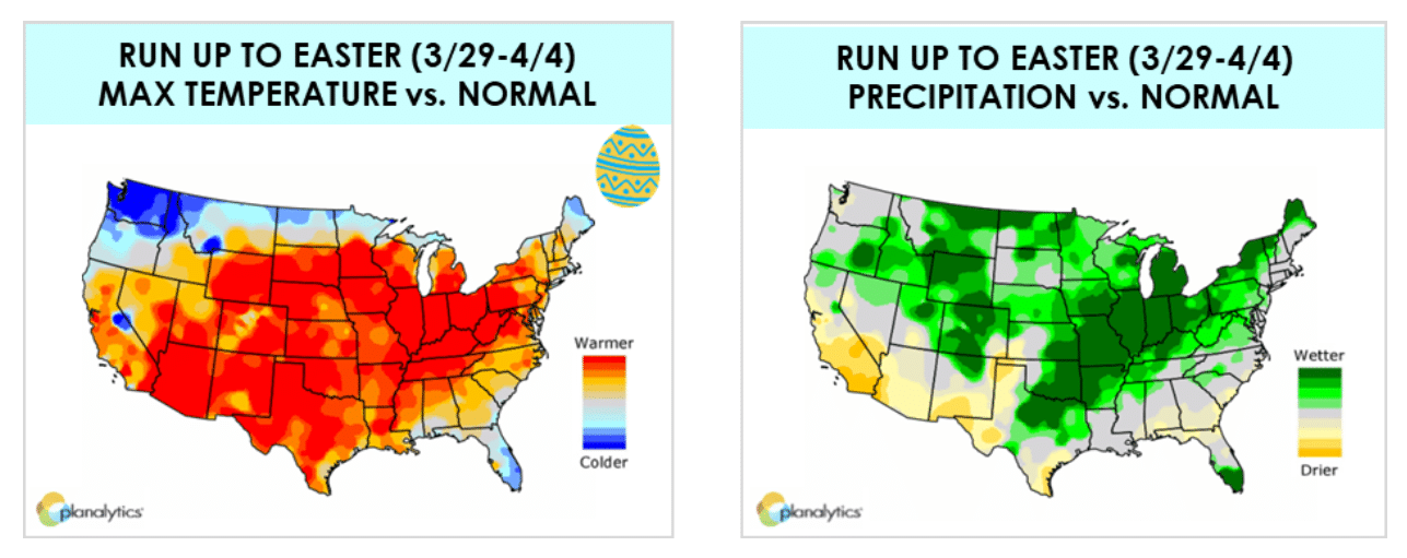 • Wetter and cloudier conditions are expected to remain in place for many central and eastern markets heading into Easter weekend, which could create more variability in foot traffic and outdoor holiday activity.