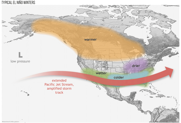 By fall, the jet stream is expected to shift into a more consistent El Niño pattern. The colder months of the year are when El Niño’s effects are most reliable: