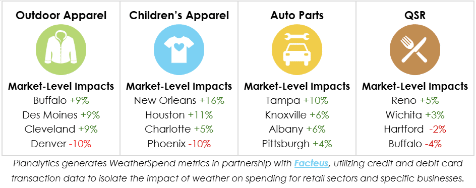 The following WeatherSpend℠ metrics quantify the impact of weather on topline sales in different markets and retail sectors compared to November 2024.