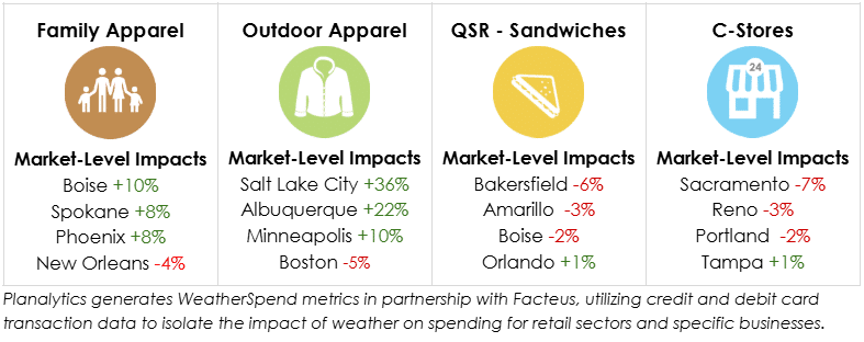 The following WeatherSpend metrics quantify the impact of weather on topline sales in different markets and retail sectors compared to October 2024.