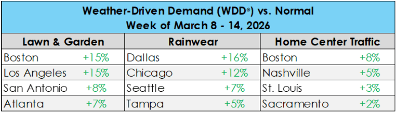 Many consumers are weather weary from recent snowstorms, deep freezes, and icing events. The transition from a harsh winter to early-season warmth will drive a significant lift in demand for Spring categories. Because the upcoming warming trend is paired with an active storm track, businesses should focus on agility to capture a fluctuating demand cycle: